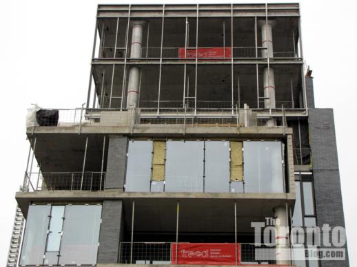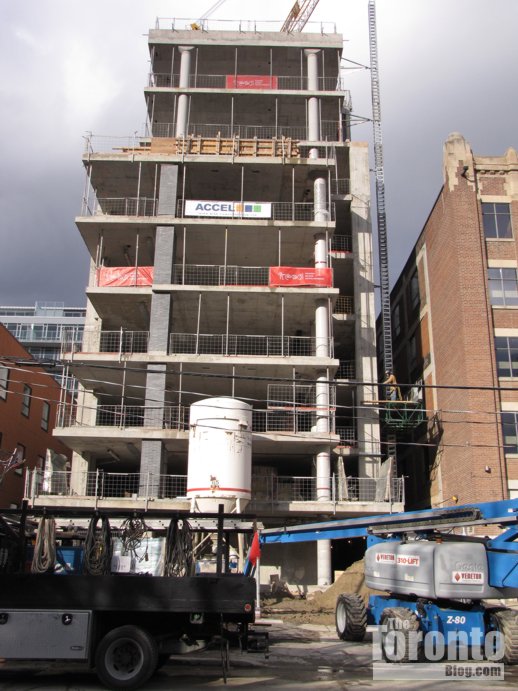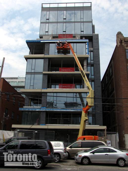 A project of Freed Developments, this 10-storey boutique condo building is nearing completion. Designed by Core Architects, 500 Wellington West has 17 luxury suites that occupy either half or full floors. It’s just a short walk west of the 400 Wellington project site (above), and even closer to the Victoria Memorial Park at Portland Street. Below are photos showing construction progress in June and July. Pictures of earlier stages of construction can be viewed in my February 27 2011 post and in my January 16 2011 post.