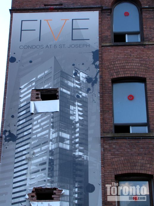 April 19 2010: A view of the southwest corner of Yonge and St Joseph Streets. A long advertising banner indicates the Yonge Street properties that are part of the FIVE Condos development site