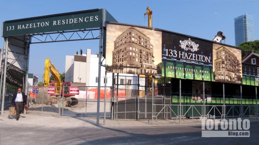 This was how The Yorkville Condominiums site appeared only three years ago (November 1 2010, to be precise), before construction had commenced. The Florian condo tower next door was just halfway up, and several low-rise buildings still occupied The Yorkville’s prime corner site. Those buildings had formerly housed offices for the firm of Moriyama and Teshima Architects.