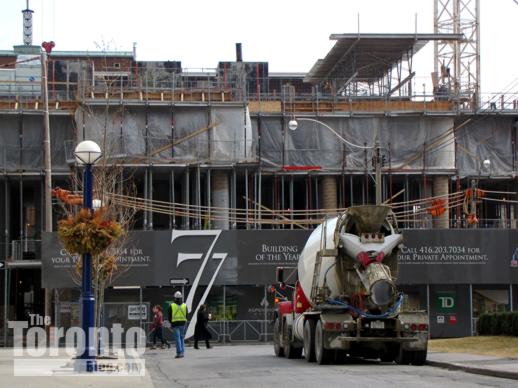Going green: Construction on the 77 Charles West luxury condo midrise could be topping off later this month, now that 12 of the building’s 13 floors have been built. Meanwhile, down at street level, the facade is beginning to reflect some of its nearby condo neighbours as its striking green-hued curtain wall cladding gradually gets installed.