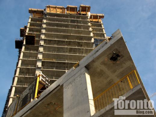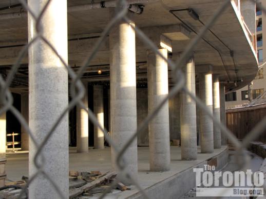 A project of Aspen Ridge Homes, the dual-purpose complex at 77 Charles West was designed by Yann Weymouth of international architecture firm HOK. You can read exactly how Weymouth has integrated two separate buildings into one mixed-use structure in this informative March 16 2007 column by John Bentley Mays of The Globe and Mail, so I won’t repeat those details here. Will Weymouth’s design vision for this unusual building combination succeed? We should be able to tell if he’s managed to pull it off once Seventy Seven’s glass curtain wall starts taking form, likely later this year.