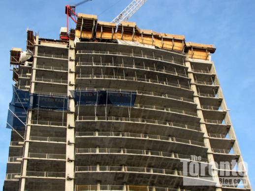 February 15 2011: View of 77 and its neighbours on Charles Street West. The cement truck is at 77 Charles, while One St. Thomas is the building at right. The sales office for The St Thomas condos is visible on the next block.