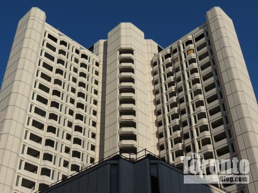 On Wednesday afternoon, I watched as crews removed sections of the concrete exterior of the 19-storey building at 90 Gerrard Street West, a midrise tower that was originally constructed as a nursing student residence in 1969 and, in recent years, operated as a budget hotel called The Residence. (The accommodations had been popular with patients — and their families — who had to come to Toronto for appointments and treatments at Toronto General Hospital and the Hospital for Sick Children across the street, as well as other downtown medical institutions.)