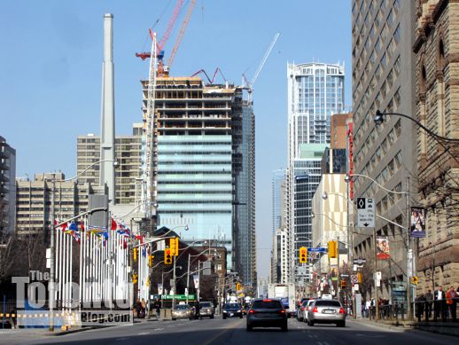 March 14 2012: Garrison at the Yards construction progress viewed from the northeast at the intersection of Bathurst Street and Fort York Boulevard