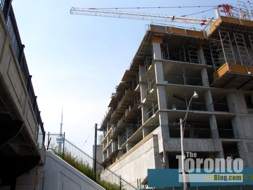 September 26 2011: Sherbourne Street view looking west toward the proposed condo tower site. The apartment building at left is 155 Wellesley St. E., while the condo tower at right rear is the 39-storey Verve at Wellesley & Homewood Ave.