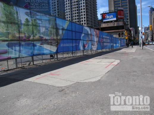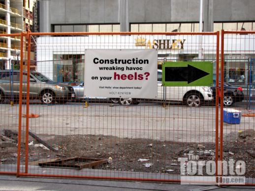 April 19 2010: A view of the southwest corner of Yonge and St Joseph Streets. A long advertising banner indicates the Yonge Street properties that are part of the FIVE Condos development site