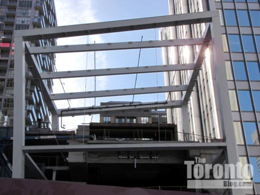 April 1 2011: The Nicholas Residences highrise will tower above these buildings which front on Yonge Street. The building at left houses a Flight Centre travel agency, while the one at right is Zelda’s restaurant (the tacky structure with the sloped roof shelters an outdoor dining terrace).