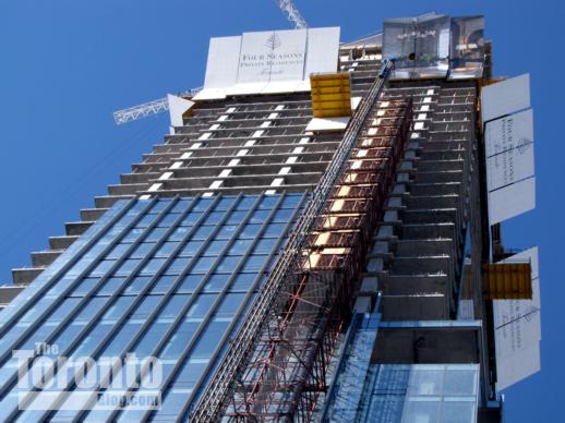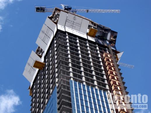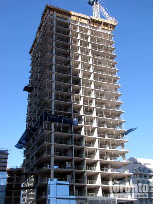 Below are some of the photos I’ve taken of the Nicholas Residences site, along with renderings by the project designer, Core Architects Inc., of both the original tower proposal and revised 35-storey building that will be constructed. Those illustrations appear in the project application report on the City of Toronto website.
