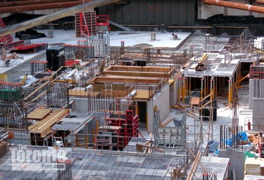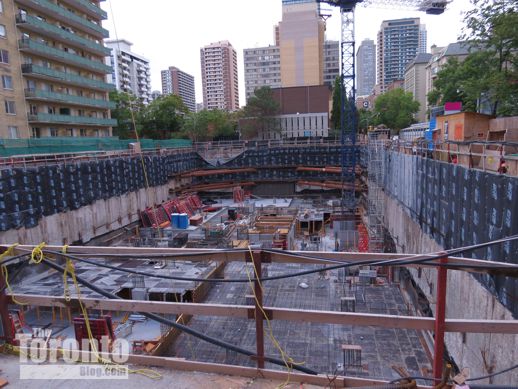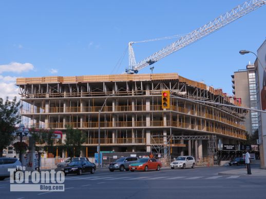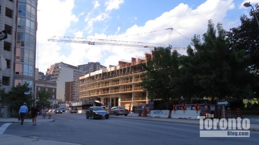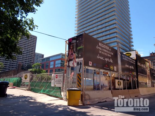 October 10 2012: Looking north on Yonge from Irwin Street. The 625 Yonge development site (white building with the yellow and black YSFC banners) has the cachet of being situated only three blocks south of the prime Yonge & Bloor intersection.