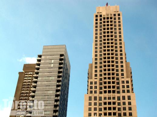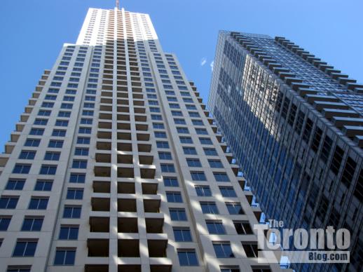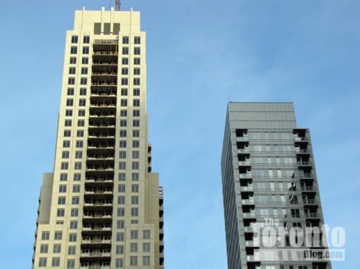 January 29 2011: From this unusual perspective on the west side of Bay Street, the Manulife Centre towers (left and right) appear to completely dwarf The Uptown Residences and Crystal Blu condo towers