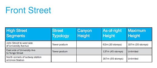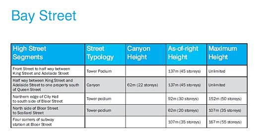 The consultants recommended six height range categories for buildings fronting on high streets: 47 to 77 meters (15 to 25 storeys), 62 to 107 meters (20 to 35 storeys), 77 to 137 meters (25 to 45 storeys), 92 to 152 meters (30 to 50 storeys), 107 to 182 meters (35 to 60 storeys), and 137 meters and up (45 storeys and higher).