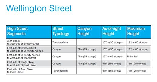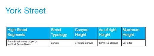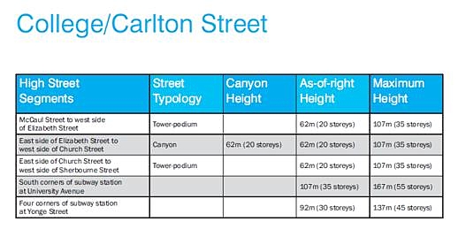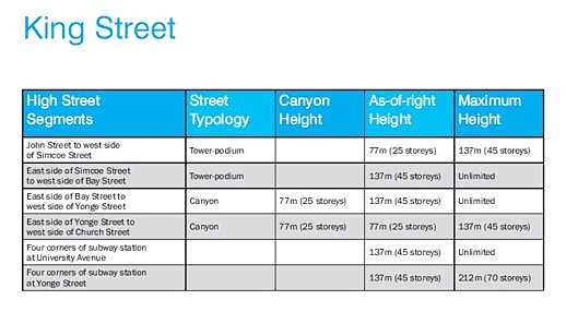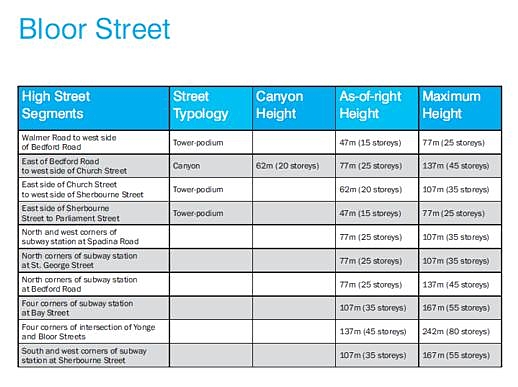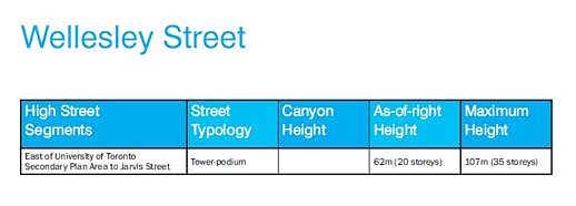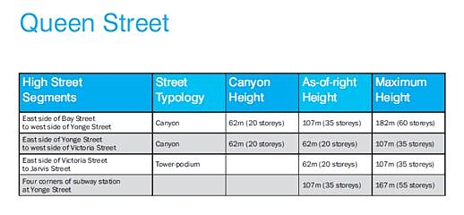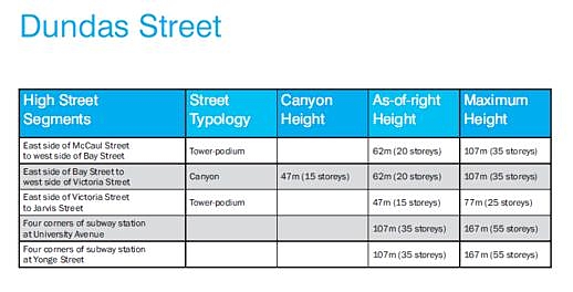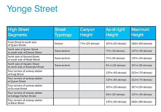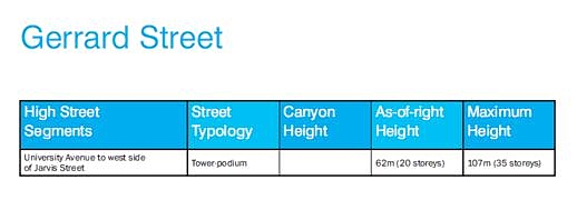 The charts below, also from the City’s Tall Buildings Study webpage, outline street typologies and height recommendations for specific designated high streets:
