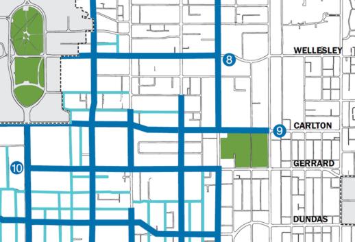 High streets southeast of Queen’s Park include College/Carlton as far east as Sherbourne, Gerrard between University Avenue and Jarvis, and Dundas to Jarvis.