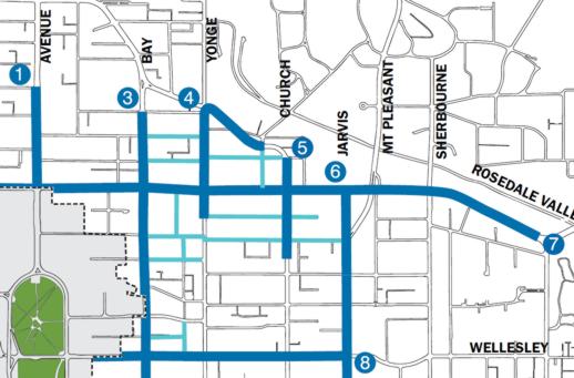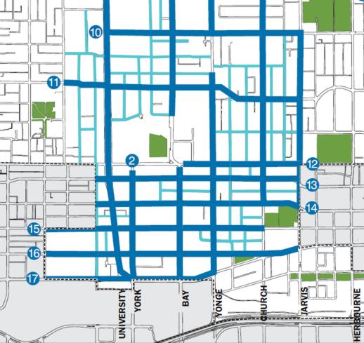 The study determined that tall buildings are appropriate for 17 downtown streets: University Avenue/Avenue Road; York Street; Bay Street; Yonge Street; Church Street; Jarvis Street; Bloor Street; Wellesley Street; College/Carlton Street; Gerrard Street; Dundas Street; Queen Street; Richmond Street; Adelaide Street; King Street; Wellington Street; and Front Street. High streets are indicated in blue on the maps below: