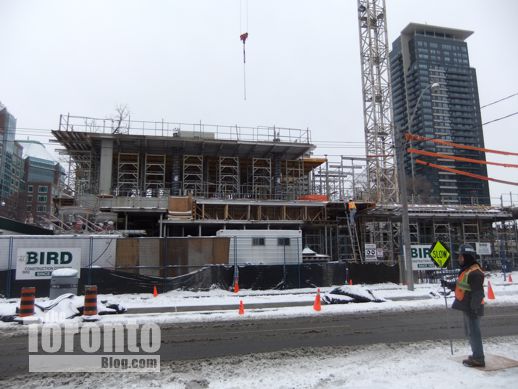 Overlooking the long, rectangular excavation for the 49-storey X2 Condos tower under construction at the southwest corner of Jarvis & Charles Streets