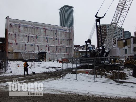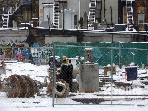 Despite the light snow cover, a drilling rig (rear right) was busy jackhammering a concrete pad at the northwest corner of the Chaz.Yorkville site