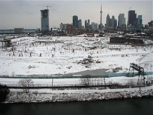 The vast construction zone for the new West Don Lands Community is seen in this image taken by a Waterfront Toronto webcam this afternoon. The 80-acre site was blanketed with light snow this morning, less than 24 hours after Waterfront Toronto and Infrastructure Ontario announced that long-awaited construction is finally commencing on the new mixed-use residential community a short distance east of the downtown business district. The highrise under construction at upper left is the 40-storey Clear Spirit condo tower in the nearby Distillery District.