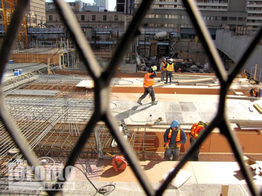 This February 15 photo shows construction workers atop foundation forms level with Yonge Street near the north end of the condo tower construction site…