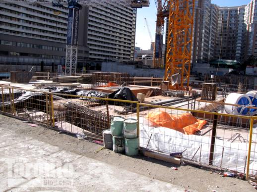 February 15: Street-level foundation forms extend to the first crane