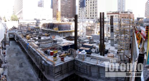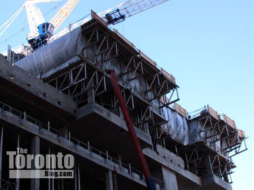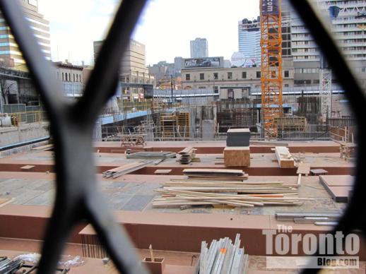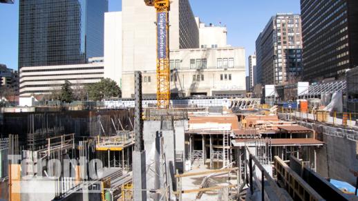 December 12 2011: Construction platforms cantilever five and six storeys above Gerrard Street