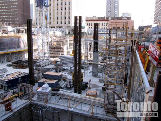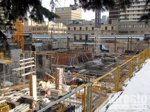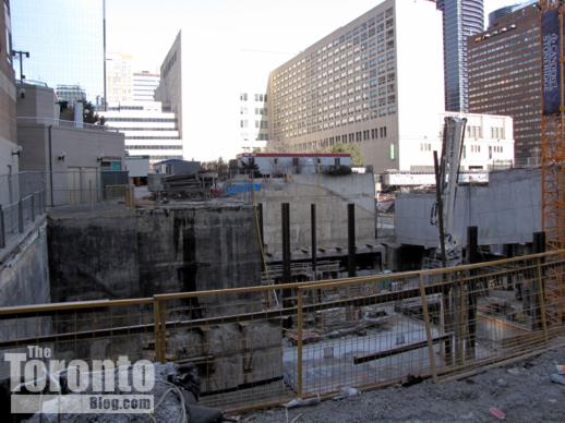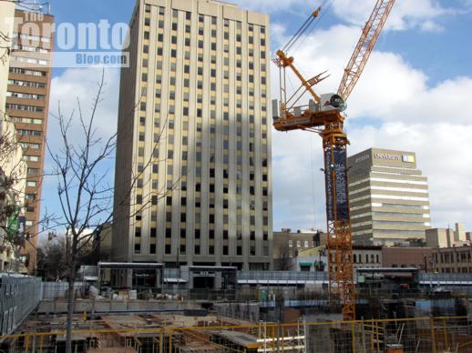 December 12 2011: The south side of Aura’s enormous podium viewed from the Gerrard Street entrance to the Chelsea Inn, looking east toward Yonge Street