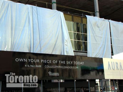 December 12 2011: Passersby get a peek at some of the windows through this gap in tarps along the podium’s Yonge Street facade