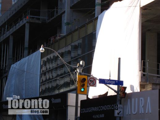 December 12 2011: White tarps cover some of the newly-installed windows along the Yonge and Gerrard Street sides of Aura’s mammoth podium