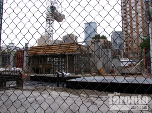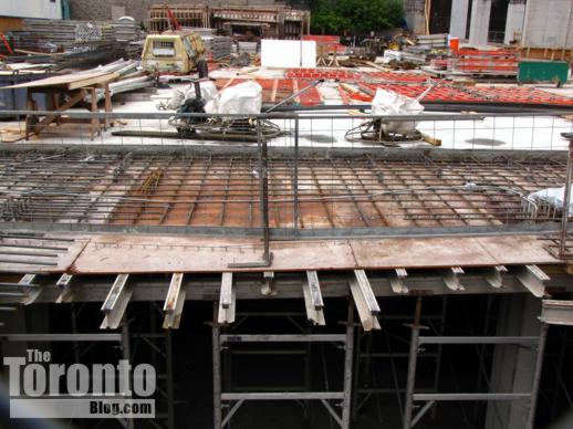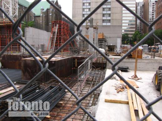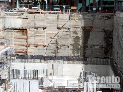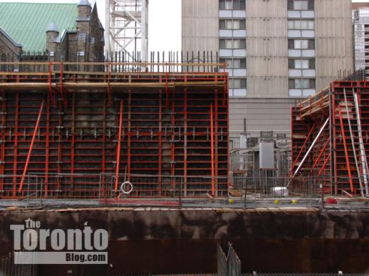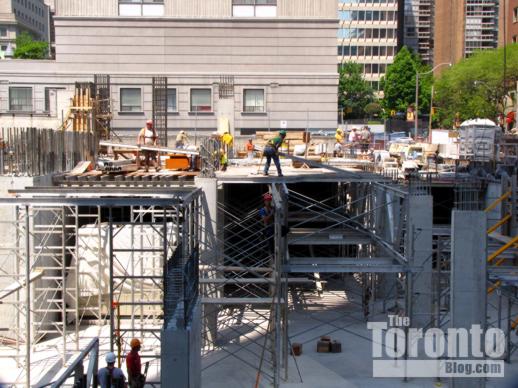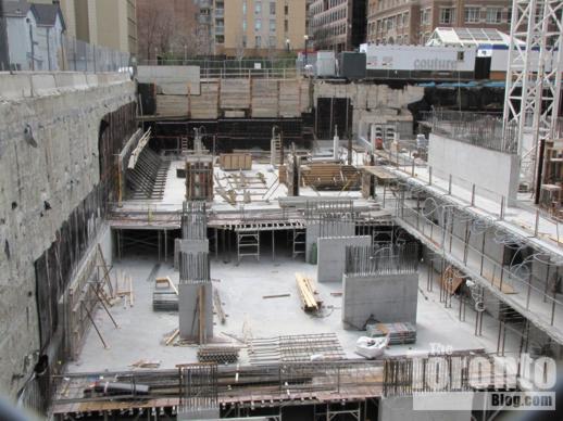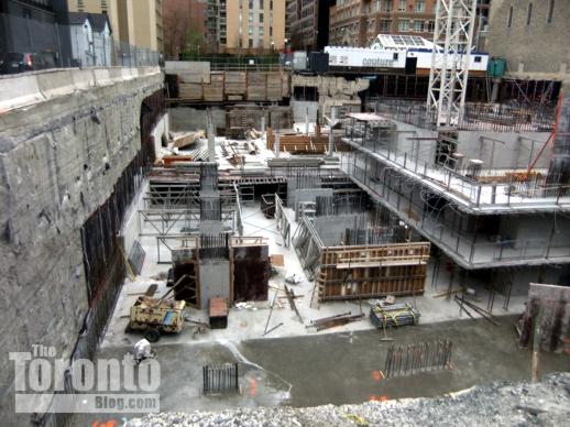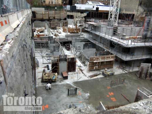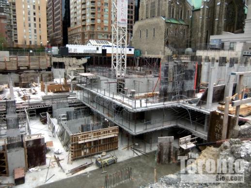 Halfway up: The Couture Condominium tower continues its ascent half a block south of the intersection of Bloor & Jarvis Streets. When I passed by the project site last Friday, a construction supervisor told me that crews were working on the 21st floor — almost the halfway point for the luxury condo highrise. (The Couture website states that the tower will have 44 floors, but the supervisor and a construction worker both insisted the building will be topping off at 42. However, a September 2011 construction update on the website says “the project consists of a 2 level podium, from which the 42 storey tower emerges.” )