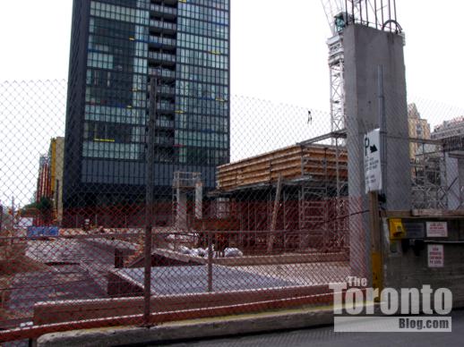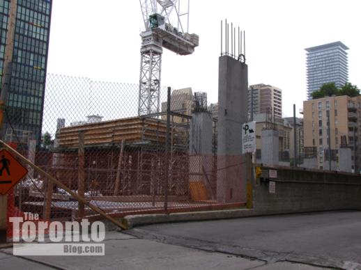 November 4 2011: Looking up the west side of the Couture Condominium tower (center) from nearby Hayden Street. Now 21 storeys, Couture will soon overtake the 28-storey Residences on Bloor apartments to its north (left) and ultimately rise nearly as high as the 44-floor X Condominium tower to its south.