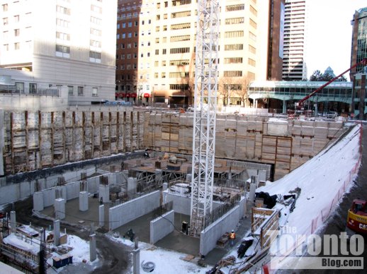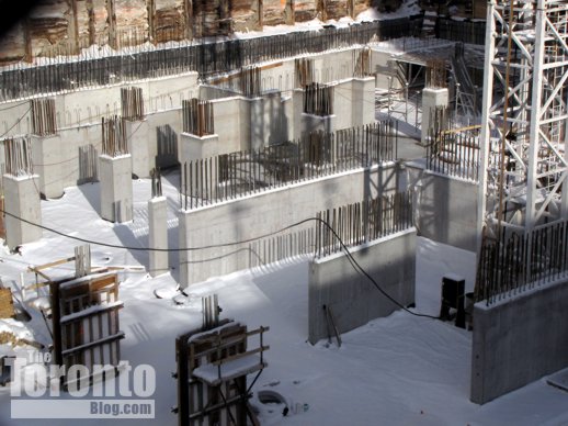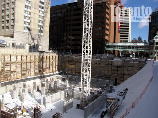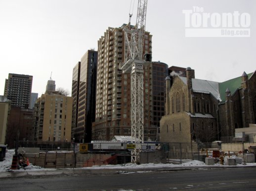 …while this photo shows how the building site appeared this past winter on February 28 2011. The two brown brick buildings on the corner site are former Children’s Aid Society of Toronto facilities that are currently being demolished