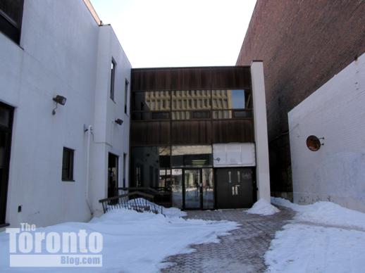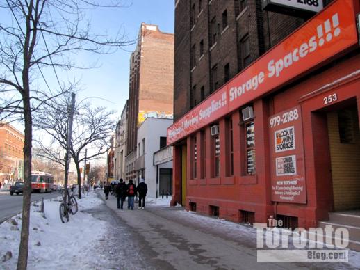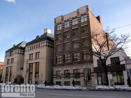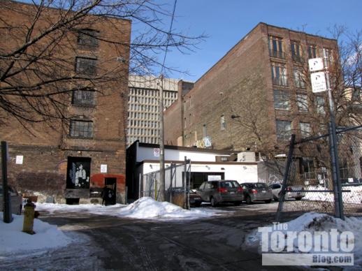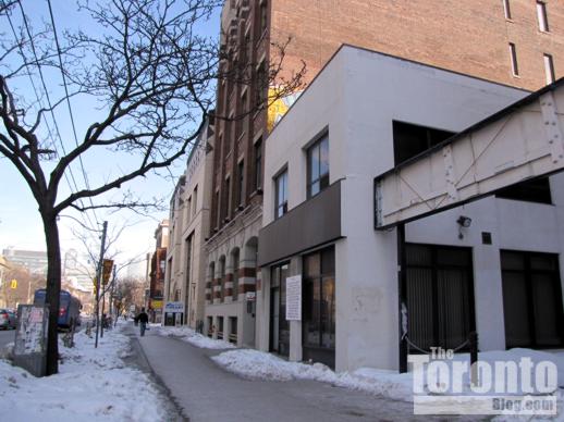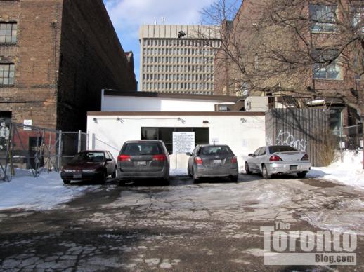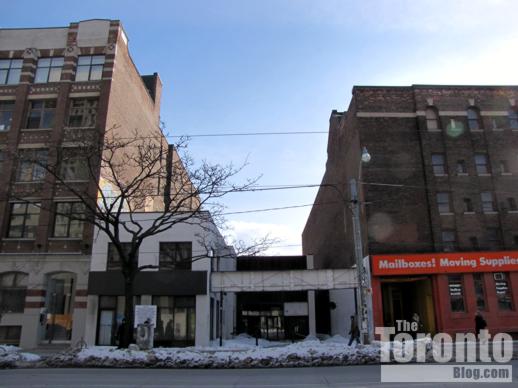 View of the site (the short white building and the three-storey brown brick structure to its right), looking southwest from corner of College and Huron Streets