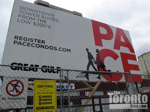Great Gulf Homes initially proposed a 46-storey condo tower for this site, as I reported in a March 22 2011 post. On November 29 2011, the City approved a 42-storey tower instead, and construction of Pace Condos could begin this spring.