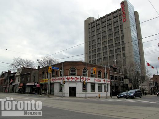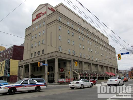 January 6 2012: The hotel viewed from the southeast corner of Dundas and George Streets. Chain restaurants and retail stores occupy the ground floor along Dundas.