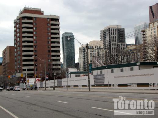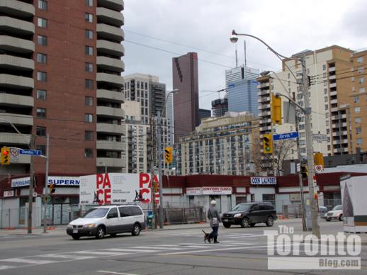 March 22 2011: Looking north from Dundas Street. This view could someday be dominated by condo towers if the parking lot in front of 222 Jarvis (blocked from view by the hoarding and construction trailers) is sold for redevelopment.