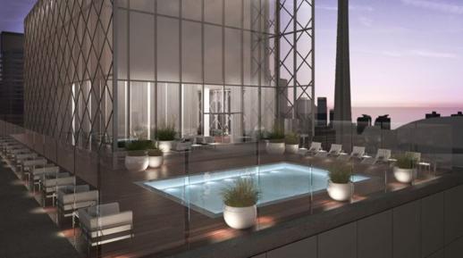 King Charlotte Condos website rendering of the outdoor swimming pool and terrace on the tower’s 33rd floor amenities area