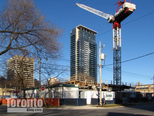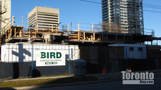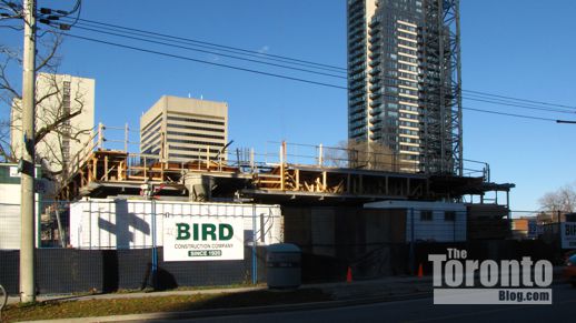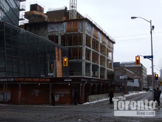 …while this photo shows how the building site appeared this past winter on February 28 2011. The two brown brick buildings on the corner site are former Children’s Aid Society of Toronto facilities that are currently being demolished