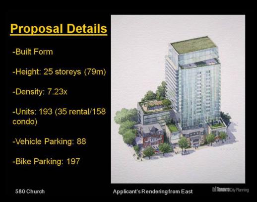 The developer proposed to demolish some of the rental buildings and one of the mansions, constructing in their place a 25-storey condo tower atop a seven-storey podium. 35 replacement apartments would be built in the podium, while an additional 158 residences would be included in the condo complex.
