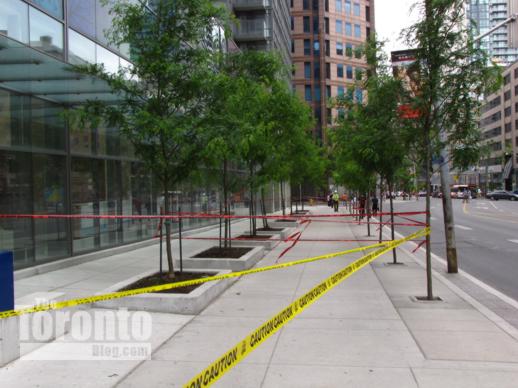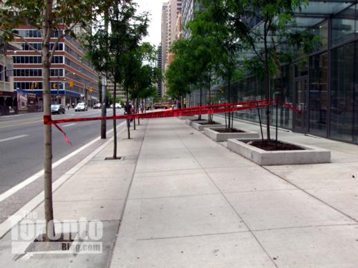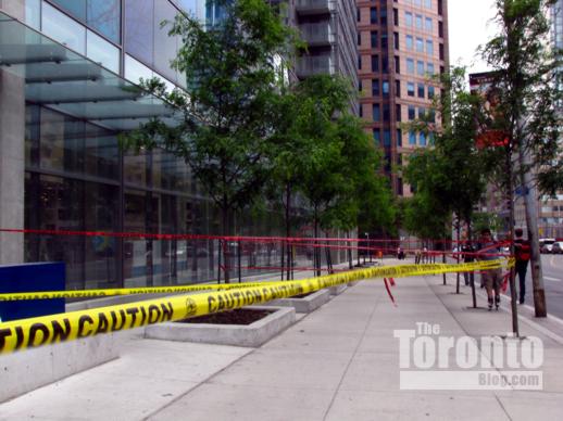 August 15 2011: The Bay and Grenville Street sidewalks below the Murano condo towers have been closed to pedestrians