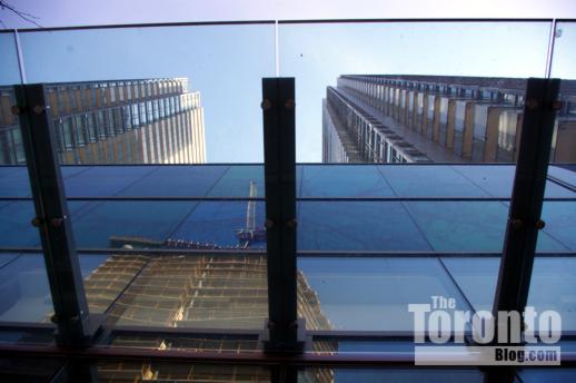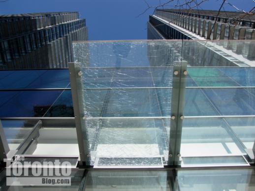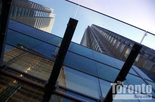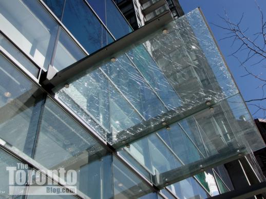 South tower’s turn: Local news media are reporting that a pedestrian suffered minor injuries this morning after she was struck by pieces of broken glass that fell from a balcony panel on the south Murano condo tower at the corner of Bay and Grenville Streets.