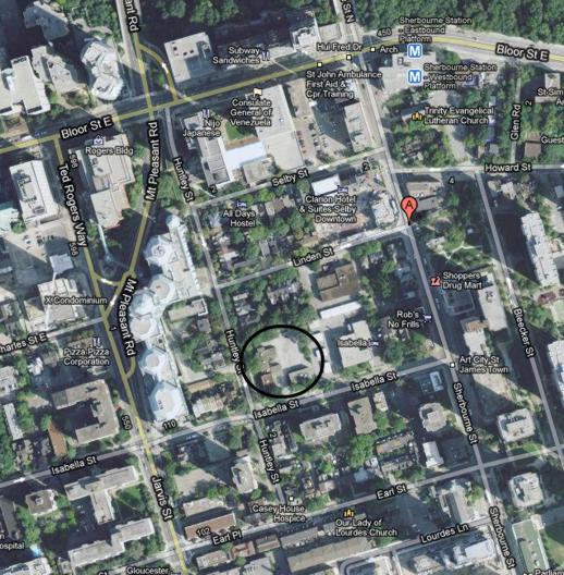 The Huntley-Isabella neighbourhood is bounded on three sides by busy downtown thoroughfares: Jarvis Street on the west, Bloor Street on the north, and Sherbourne Street on the east. Isabella runs east-west, linking Jarvis and Sherbourne. Earl Street and Earl Place, to its south, are quiet cul-de-sacs on the east and west sides of Huntley Street, respectively. The area is predominantly residential in character, with several highrise and lowrise apartment buildings plus numerous semidetached three-storey homes on tree-lined Selby, Linden and Huntley Streets, as well as on Earl Street and Earl Place. The area also is home to the Casey House HIV/AIDS hospice, the Isabella Hotel & Suites, the Sacré-Coeur Catholic elementary school, a campus of the Msgr. Fraser College adult learning centre, and various offices (the massive Rogers Communications head office building looms large over the neighbourhood from the northwest, while the Greenwin Square office tower, highrise apartment building and shopping centre complex do the same from their location to the north between Bloor and Selby Streets).