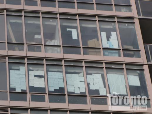 Interior design work orders taped to the windows of a tower suite