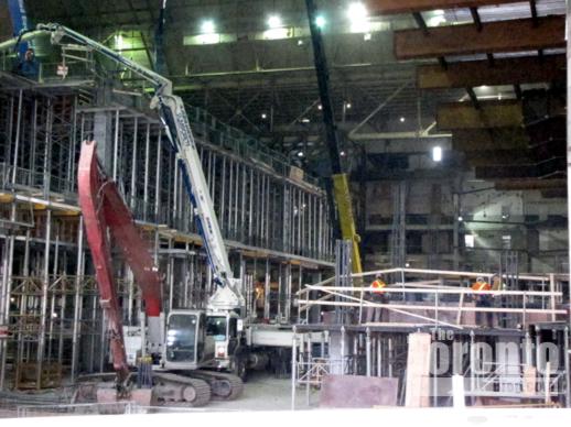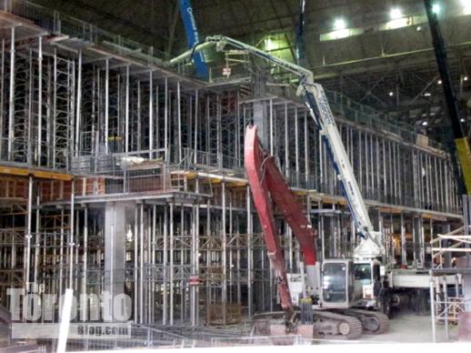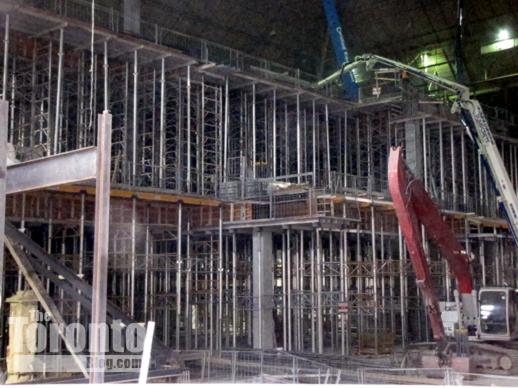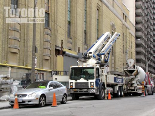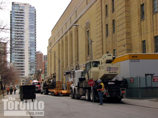 November 17 2011: Construction activity on the north and east sides of Maple Leaf Gardens. On weekdays, the building is constantly surrounded by cranes, equipment supply vehicles, and concrete delivery trucks and pumpers.