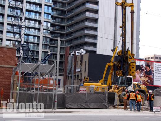 I knew construction was imminent when the property was fenced off in late summer; pile driving equipment arrived on scene in late fall and hoarding went up over the Bay and Dundas Street sidewalks in late October and early November.
