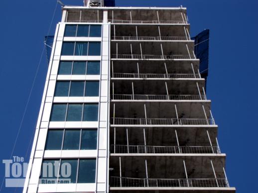February 3 2013: You can’t see it from the street, but demolition is well under way inside the buildings behind the fences and hoarding at 192, 194 and 200 Bloor Street West, where developer Bazis Inc. will build its distinctive “twisting cube” Exhibit Residences condo tower
