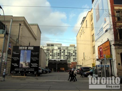 September 26 2008: Adelaide Street West view down Charlotte Street towards the Langston Hall condo sales centre, The Charlotte Condos, and Glas Condos.