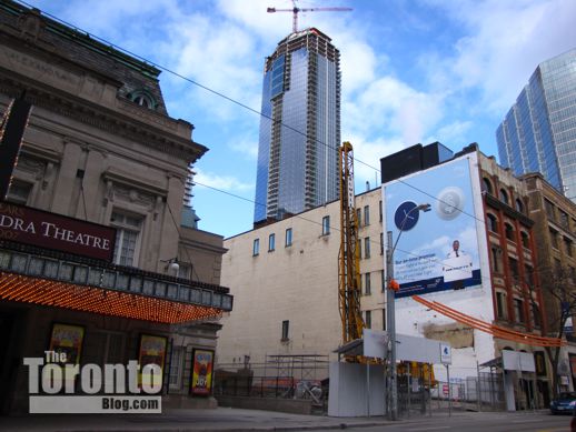 March 11 2010: King Street West view toward Charlotte Street. The King Charlotte condo site is the white building with the turquoise sign on its roof (in the middle of the photo). The construction crane is building Charlie Condos at the corner of Charlotte and King; the Glas condominium midrise stands to its immediate north.
