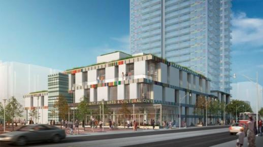 A rendering of the Regent Park Arts and Cultural Centre and Paintbox condo tower currently under construction on Dundas Street East
