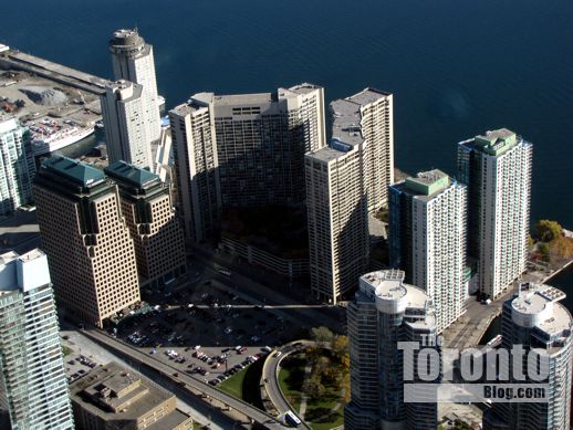 November 2 2010: This photo, taken from the CN Tower, shows the parking lot area where the RBC WaterPark Place tower is currently under construction