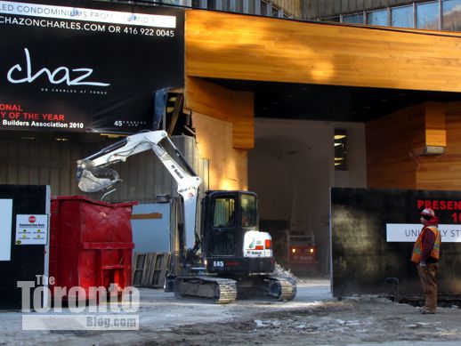 December 8 2011: An excavator loads a dumpster with rubble collected from inside the entrance to 45 Charles Street East. The mid-1960s-era office building is being demolished to make way for construction of the Chaz.Yorkville condo tower