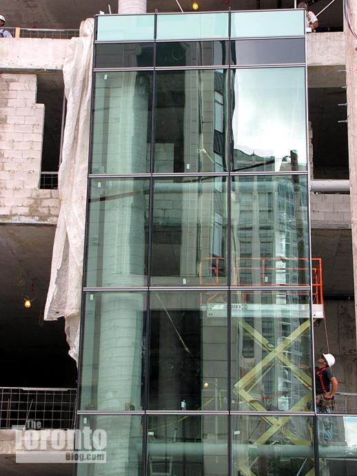 August 8 2011: Crews install the first 3-storey section of glass cladding